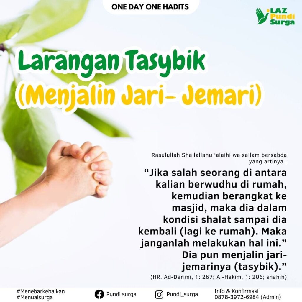 Dibuat oleh : Administrator Jum’at, 24 November 2023 ONE DAY ONE HADITS Jum’at, 24 November 2023 10 Jumadil Awal 1445 H 💖 Larangan Tasybik (Menjalin Jari-Jemari) 💖 •┈┈┈┈┈•❁﷽❁•┈┈┈┈┈• Dari Abu Hurairah radhiyallahu ‘anhu, Rasulullah shallallahu ‘alaihi wa sallam bersabda, إذا توضأ أحدكم في بيته ثم أتى المسجد كان في صلاة حتى يرجع فلا يفعل هكذا وشبك بين أصابعه “Jika salah seorang di antara kalian berwudhu di rumah, kemudian berangkat ke masjid, maka dia dalam kondisi shalat sampai dia kembali (lagi ke rumah). Maka janganlah melakukan hal ini.” Dia pun menjalin jari-jemarinya (tasybik).” (HR. Ad-Darimi, 1: 267; Al-Hakim, 1: 206; shahih) 🌺 Faedah Hadits : 🌺 🔰 1- Al-Khaththabi rahimahullah berkata, “Yang dimaksud dengan tasybik adalah memasukkan (menganyam) sebagian jari-jemari ke sebagian jari-jemari yang lain. Sebagian orang melakukannya secara sia-sia saja. Sebagian orang terkadang membunyikan (ruas) jari-jemarinya ketika Engkau menjumpai mereka sedang berbaring atau terlentang. Terkadang seseorang duduk, kemudian melakukan tasybik dan bersandar dengan kedua tangannya, karena ingin duduk santai. Dan terkadang hal itu menyebabkan datangnya rasa kantuk, sehingga menjadi sebab batalnya wudhunya.” (Ma’aalim As-Sunan, 1: 295) 🔰 2- Menjalin jari-jemari terlarang dilakukan sebelum shalat, yaitu ketika menunggu shalat. Sebagaimana hadits: إذا كان أحدكم يصلي فلا يشبكن بين أصابعه “jika salah seorang dari kalian shalat, maka janganlah menjalin jari-jemarinya” karena orang yang menunggu shalat itu sebagaimana orang yang shalat. 🔰 3- Adapun jika sudah selesai shalat, tidak mengapa melakukan tasybik di masjid ataupun di tempat lainnya. Sedangkan jika sebelum shalat, tidak boleh. Karena orang yang menunggu shalat itu sebagaimana orang yang shalat. Bolehnya tasybik selesai shalat juga ditunjukkan oleh hadits yang lain. Dari Abu Musa radhiyallahu ‘anhu, Nabi shallallahu ‘alaihi wa sallam bersabda, إِنَّ الْمُؤْمِنَ لِلْمُؤْمِنِ كَالْبُنْيَانِ يَشُدُّ بَعْضُهُ بَعْضًا وَشَبَّكَ أَصَابِعَهُ “Sesungguhnya seorang mukmin dengan mukmin lainnya seperti satu bangunan yang saling menguatkan satu sama lain.” Kemudian beliau melakukan tasybik.” (HR. Bukhari no. 481) 🔰 4- Yang perlu diperhatikan, sebagian orang ketika menunggu shalat juga berbuat sia-sia dengan menekuk atau melipat ruas-ruas jarinya sehingga menimbulkan bunyi (suara). Ini juga perbuatan sia-sia yang seharusnya ditinggalkan, sebagaimana perkataan Al-Khaththabi di atas. Karena sekali lagi, jika hati itu khusyu’, maka akan tercermin dalam khusyu’-nya seluruh anggota badan yang lain. Sumber : muslim.or.id —————————————————— 📌Yuk berikan sedekah terbaik anda dihari jum’at yang mulia ini: 💳 BSI 444.567.0100 💳 Muamalat 531.007.0697 [A.n. Pundi Surga] 🔖 Info dan Konfirmasi: 0878-3972-6984 (Admin)